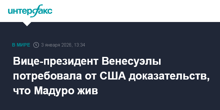 Москва. 3 января. INTERFAX.RU - Власти Венесуэлы не знают, где находится президент страны Николас Мадуро и требуют от США предоставить доказательства того, что он жив, заявила венесуэльский вице-президент Делси Родригес.