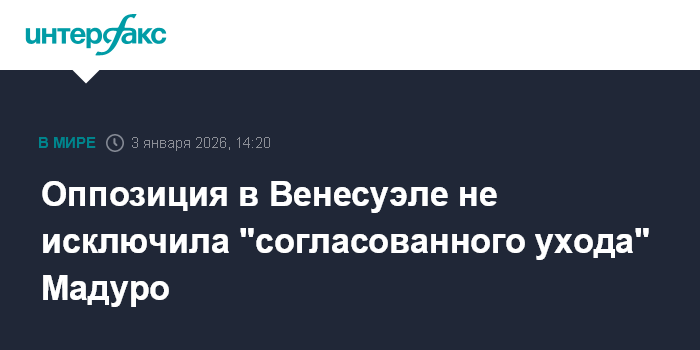 Москва. 3 января. INTERFAX.RU - Пленение и вывоз из Венесуэлы президента Николаса Мадуро и его жены был "согласованным уходом", сообщили телеканалу Sky News информированные источники в венесуэльской оппозиции.