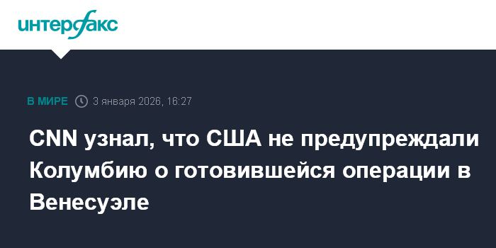 Москва. 3 января. INTERFAX.RU - Власти США не направляли Колумбии заблаговременное предупреждение о намерении провести операцию по захвату президента Венесуэлы Николаса Мадуро, сообщил в субботу телеканал CNN со ссылкой на источник.