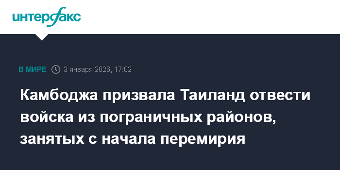 Москва. 3 января. INTERFAX.RU - Власти Камбоджи заявили, что войска Таиланда заняли ряд спорных приграничных территорий с начала действия перемирия 27 декабря пошлого года, и призвали Бангкок убрать военных из этих районов.