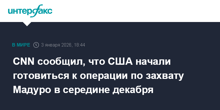 Москва. 3 января. INTERFAX.RU - Власти США с середины декабря прошлого года вели приготовления к операции по пленению президента Венесуэлы Николаса Мадуро, сообщил в субботу телеканал CNN со ссылкой на источники.