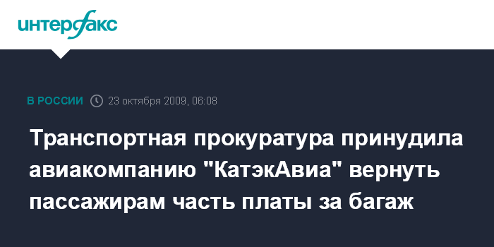 Красноярск. 23 октября. ИНТЕРФАКС-СИБИРЬ - Енисейская транспортная прокуратура принудила красноярскую авиакомпанию "КатэкАвиа" вернуть пассажирам деньги, которые она незаконно взимала с них за провоз багажа.