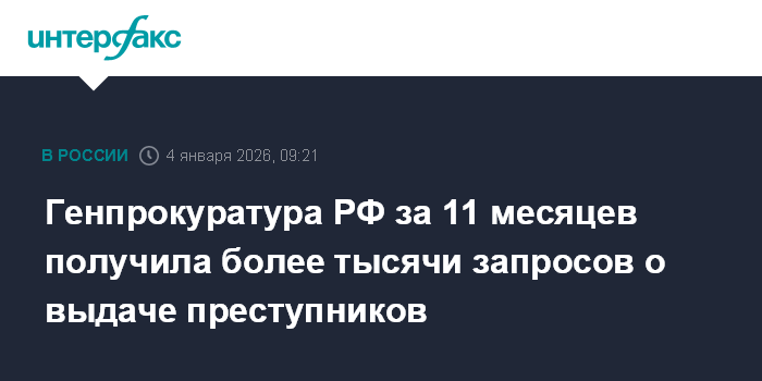 "За 11 месяцев 2025 года Генеральной прокуратурой Российской Федерации рассмотрен 1081 иностранный запрос о выдаче лиц из России. Подавляющее большинство запросов о выдаче поступило из компетентных органов государств - участников СНГ (Узбекистан, Белоруссия, Таджикистан)", - сообщили в пресс-службе Генпрокуратуры. По результатам рассмотрения этих запросов принято 807 решений о выдаче, в том числе в ОАЭ, Марокко, Латвию.