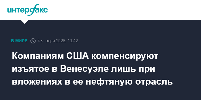 Москва. 4 января. INTERFAX.RU - Администрация США объяснила американским компаниям, что они получат компенсацию за ранее национализированное в Венесуэле имущество, если вложат средства в модернизацию нефтяной промышленности этой страны, сообщает Politico со ссылкой на источники.