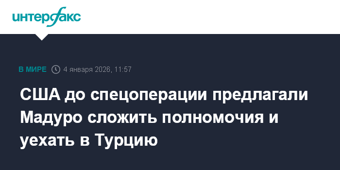 Москва. 4 января. INTERFAX.RU - Власти США 23 декабря 2025 года для урегулирования кризиса вокруг Венесуэлы предложили ее президенту Николасу Мадуро покинуть пост и выехать в Турцию, но он не согласился, сообщает The New York Times (NYT) со ссылкой на источник.