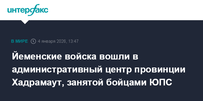 Москва. 4 января. INTERFAX.RU - Войска правительства Йемена вступили в портовый город Эль-Мукалла – административный центр провинции Хадрамаут, которую ранее взяли под контроль отряды сепаратистского Южного переходного совета (ЮПС), сообщает в воскресенье Al Arabiya.