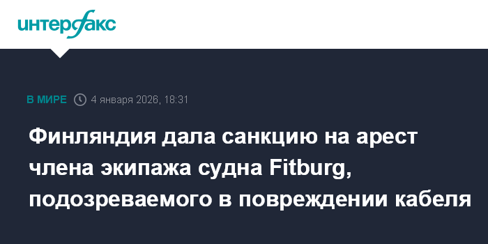 Москва. 4 января. INTERFAX.RU - В Финляндии окружной суд Хельсинки дал в воскресенье санкцию на арест члена экипажа сухогруза Fitburg, подозреваемого в повреждении телекоммуникационного кабеля.