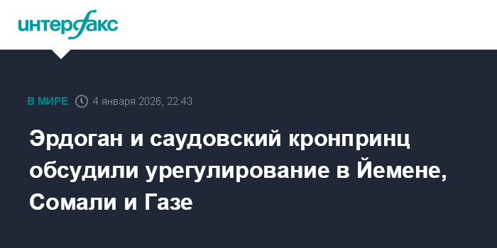Москва. 4 января. INTERFAX.RU - Президент Турции Реджеп Тайип Эрдоган и наследный принц Саудовской Аравии Мухаммед бен Салман обсудили по телефону урегулирование конфликтов в Йемене, Сомали и секторе Газа, сообщает в воскресенье газета Turkiye Today.