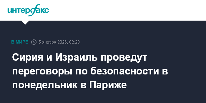 Москва. 5 января. INTERFAX.RU - Представители Сирии и Израиля встретятся в понедельник в Париже для возобновления переговоров по новому соглашению о безопасности, сообщает Axios со ссылкой на осведомленные источники.
