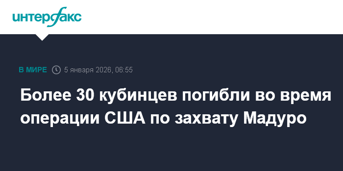 Москва. 5 января. INTERFAX.RU - 32 кубинца погибли в Венесуэле во время операции США по захвату президента страны Николаса Мадуро, сообщает правительство Кубы.