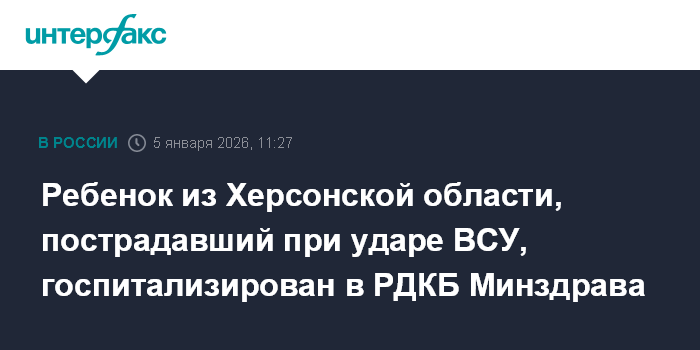Москва. 5 января. INTERFAX.RU - Пострадавший в результате удара ВСУ в Хорлах в Херсонской области ребенок госпитализирован в Российскую детскую клиническую больницу Минздрава РФ.
