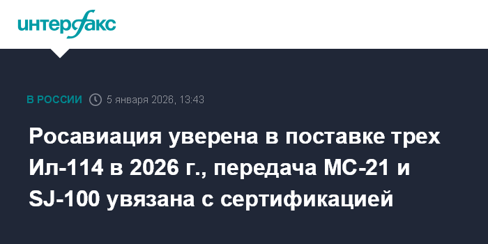 Росавиация уверена в поставке трех Ил-114 в 2026 г., передача МС-21 и SJ-100 увязана с сертификацией