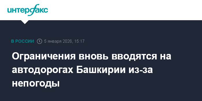 Москва. 5 января. INTERFAX.RU - Власти Башкирии из-за сильного снега, метели и снежных заносов вновь ограничивают движение на автодорогах для грузового транспорта и пассажирских автобусов, сообщает пресс-служба регионального ГУ МЧС в понедельник.