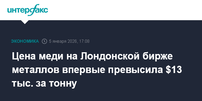 Цена фьючерсов на медь с поставкой через три месяца на Лондонской бирже металлов (LME) поднялась в ходе торгов на 4,3%, преодолев отметку в $13 тыс. за тонну.