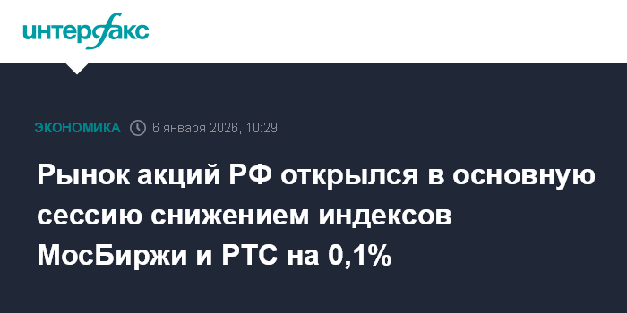 Москва. 6 января. INTERFAX.RU - Рынок акций РФ на старте торгов основной сессии на Мосбирже во вторник демонстрирует смешанную динамику blue chips на фоне улучшения внешней фондовой и сырьевой конъюнктуры, сдерживающим фактором для покупателей остается геополитическая напряженность. Индексы МосБиржи и РТС за минуту торгов просели на 0,1% из-за отсечки дивидендов за 9 месяцев 2025 года в индексных бумагах "ИКС 5" (-10,5%).