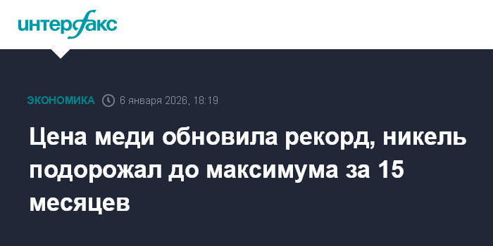 Москва. 6 января. INTERFAX.RU - Цена меди обновила рекорд на торгах во вторник, никель подорожал до максимума за 15 месяцев на информации об ограничении добычи металла в Индонезии.