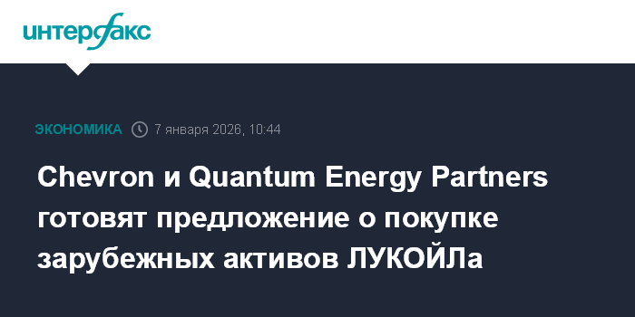 Москва. 7 января. INTERFAX.RU - Американская нефтегазовая Chevron и частная инвестиционная группа Quantum Energy Partners объединились для участия в тендере на приобретение международных активов российской "ЛУКОЙЛ", находящейся под санкциями, сообщает Financial Times со ссылкой на источники, знакомые с ситуацией.