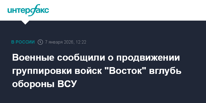 Москва. 7 января. INTERFAX.RU - Подразделения группировок "Север" и "Южная" улучшили положение в зоне СВО, группировки "Центр" и "Запад" заняли более выгодные рубежи, "Восток" - продвигается вглубь украинской обороны, заявили в Минобороны РФ в среду.