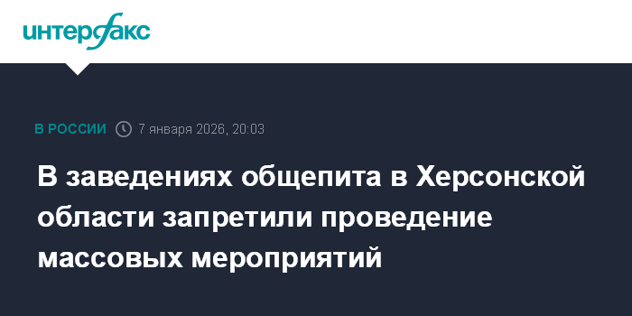 Москва. 7 января. INTERFAX.RU - Запрет на проведение массовых мероприятий в заведениях общественного питания ввели на территории Херсонской области, сообщил губернатор региона Владимир Сальдо в среду.