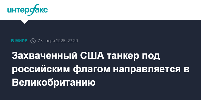 Москва. 7 января. INTERFAX.RU - Танкер Marinera под российским флагом, захваченный береговой охраной США в Северной Атлантике, в настоящее время, судя по всему, направляется в территориальные воды Великобритании, сообщают издания Mirror и Daily Mail.