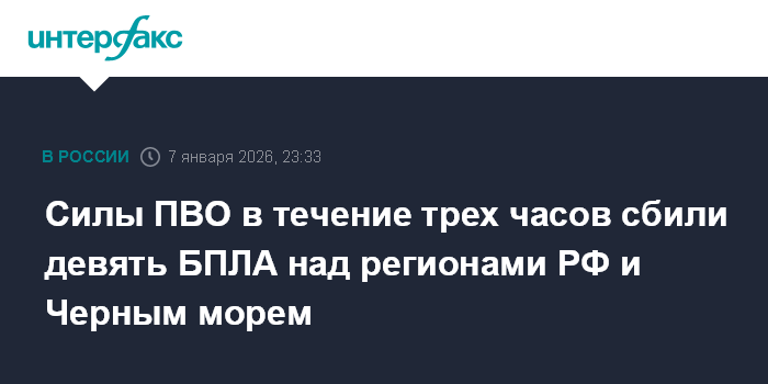 Москва. 7 января. INTERFAX.RU - В период с 20:00 до 23:00 мск среды были уничтожены девять украинских БПЛА самолетного типа над двумя регионами России и Черным морем, сообщили в Минобороны РФ.