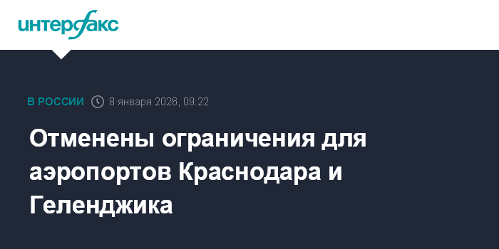 Москва. 8 января. INTERFAX.RU - Для аэропортов Краснодара и Геленджика отменены ограничения на прием и выпуск рейсов, рейсы, сообщил представитель Росавиации Артем Кореняко.