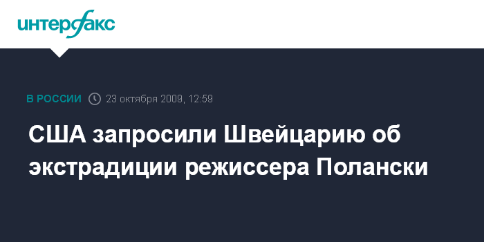 Москва. 23 октября. INTERFAX.RU - Соединенные Штаты направили официальный запрос в Швейцарию с требованием об экстрадиции французского кинорежиссера польского происхождения Романа Полански, обвиняемого в сексуальных отношениях с несовершеннолетней, сообщает в пятницу британская телерадиокорпорация Би-би-си со ссылкой на заявление швейцарских властей. В заявлении министерства юстиции Швейцарии говорится, что ведомство одобрило просьбу США, но Полански может обжаловать это решение.