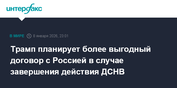 Москва. 8 января. INTERFAX.RU - Если срок действия Договора о сокращении стратегических наступательных вооружений (ДСНВ) истечет, США заключат с Россией более удачный договор, заявил в четверг президент США Дональд Трамп.