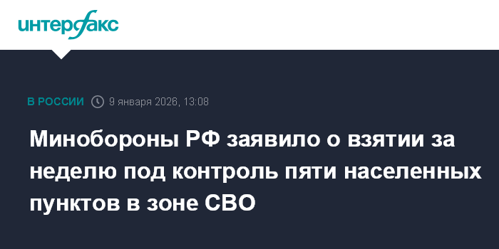 Москва. 9 января. INTERFAX.RU - Российские военные заявили, что в течение недели установили контроль над пятью населенными пунктами - в Сумской, Харьковской, Запорожской, Днепропетровской областях и в ДНР.