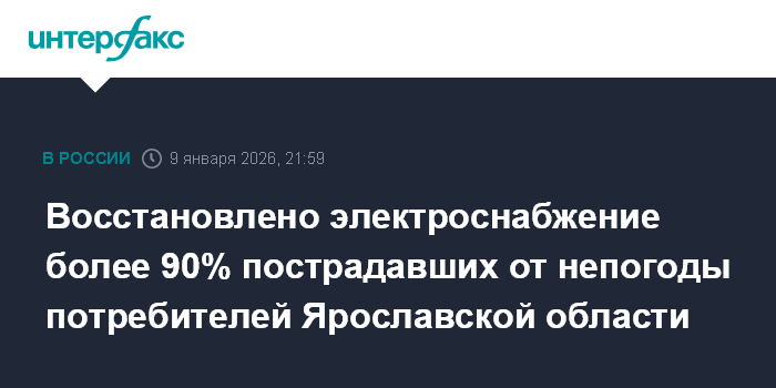 Москва. 9 января. INTERFAX.RU - Специалисты восстановили электроснабжение более 90% потребителей Ярославской области, оставшихся без света из-за непогоды, сообщила пресс-служба филиала "Россети Центр" - "Ярэнерго" в пятницу.