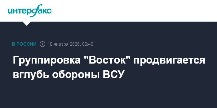 Москва. 10 января. INTERFAX.RU - Российские военнослужащие из состава группировки "Восток" продолжают вклиниваться в глубину обороны украинских вооружённых формирований, сообщил в субботу офицер пресс-центра группировки Дмитрий Миськов.