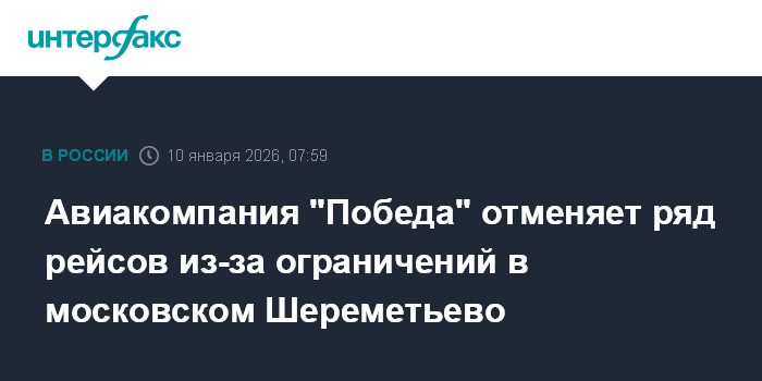 Москва. 10 января. INTERFAX.RU - Авиакомпания "Победа" из-за введенных в московском "Шереметьево" ограничений отменяет ряд рейсов.