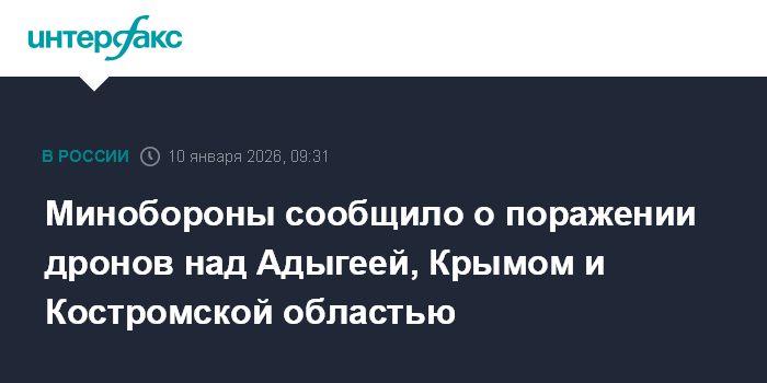 Минобороны сообщило о поражении дронов над Адыгеей, Крымом и Костромской областью