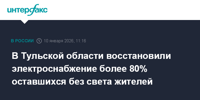 Москва. 10 января. INTERFAX.RU - В Тульской области к 10:00 восстановлено электроснабжение более 80% пострадавших от непогоды потребителей, сообщила пресс-служба "Тулэнерго" в субботу.