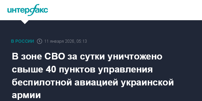 Москва. 11 января. INTERFAX.RU - Российские военнослужащие за сутки уничтожили в зоне специальной военной операции более 40 пунктов управления беспилотной авиацией вооруженных сил Украины и несколько станций спутниковой связи Starlink противника, сообщили в воскресенье официальные представители группировок войск Вооруженных сил РФ.