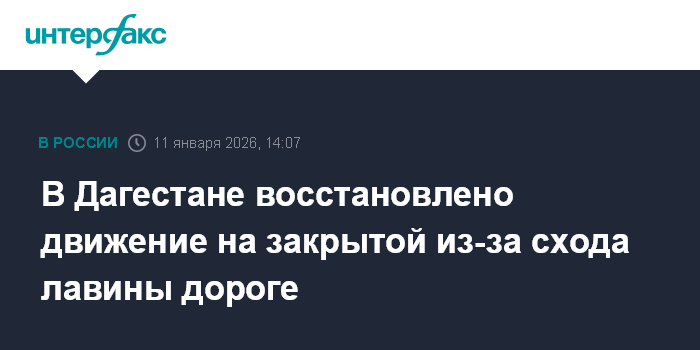Москва. 11 января. INTERFAX.RU - Дорожники восстановили движение автотранспорта на участке автодороги в Цунтинском районе Дагестана, прерванное из-за схода лавины, сообщает в воскресенье государственное казенное учреждение "Дагестанавтодор" в своем телеграм-канале.