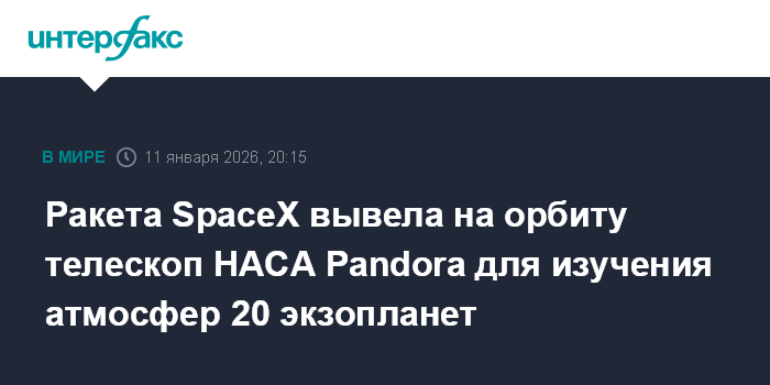 Москва. 11 января. INTERFAX.RU - Американская ракета Falcon 9 в воскресенье в рамках миссии Twilight вывела на орбиту группу из 40 исследовательских мини-спутников и кубсатов компаний и организаций, в том числе телескоп НАСА Pandora для изучения атмосфер экзопланет, сообщила компания-разработчик носителя SpaceX.