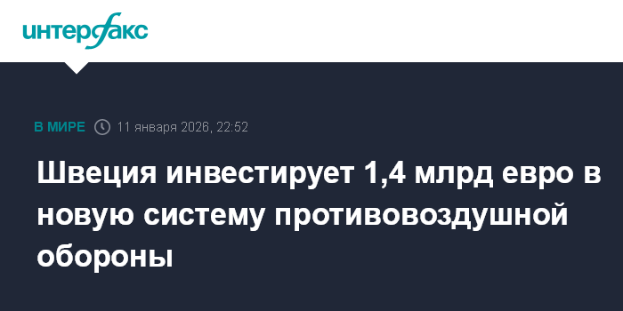 Москва. 11 января. INTERFAX.RU - Правительство Швеции поручило вооруженным силам разработать новую систему противовоздушной обороны, страна инвестирует в нее 1,4 млрд евро, сообщает SVT.