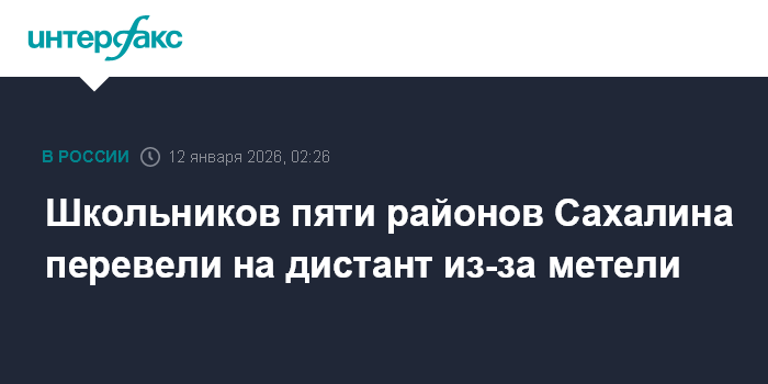 Москва. 12 января. INTERFAX.RU - Школьники пяти районов Сахалина занимаются в понедельник в дистанционном режиме из-за метели и расчистки дорог, сообщают администрации муниципалитетов этих районов.