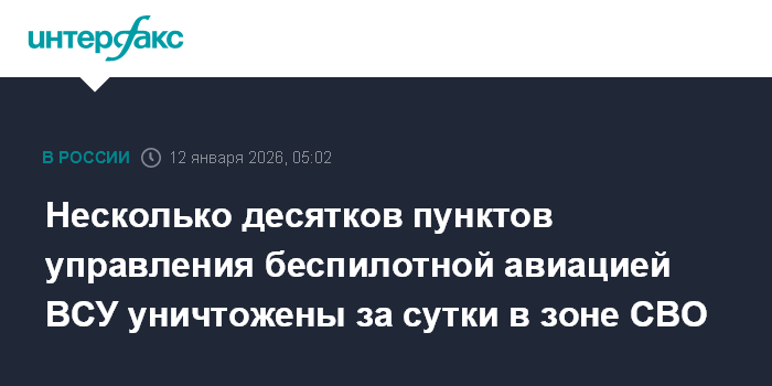 Москва. 12 января. INTERFAX.RU - Российские военнослужащие за сутки уничтожили в зоне специальной военной операции 44 пункта управления беспилотной авиацией ВСУ, сообщили в понедельник официальные представители группировок войск Вооружённых сил РФ.