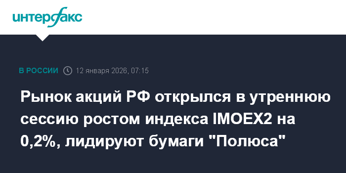 Рынок акций РФ открылся в утреннюю сессию ростом индекса IMOEX2 на 0,2%, лидируют бумаги "Полюса"