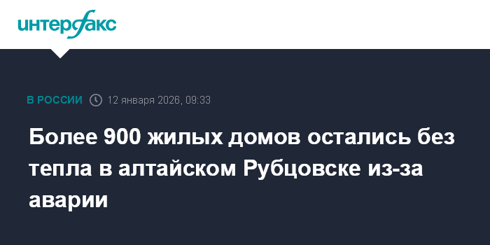 Москва. 12 января. INTERFAX.RU - Коммунальная авария на магистральном трубопроводе произошла в понедельник утром в городе Рубцовске в Алтайском крае, без тепла остались сотни многоквартирных и частных жилых домов, сообщил губернатор Виктор Томенко в мессенджере МАХ.