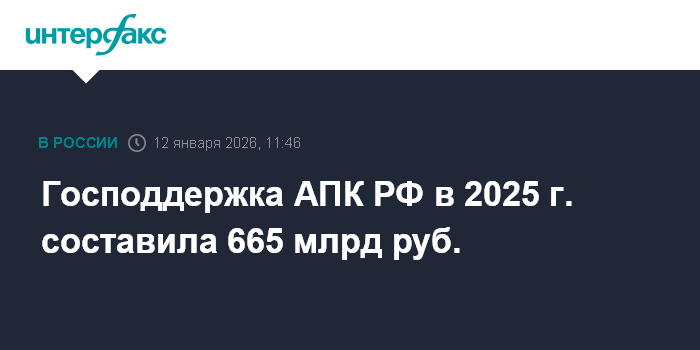 Господдержка АПК РФ в 2025 г. составила 665 млрд руб.