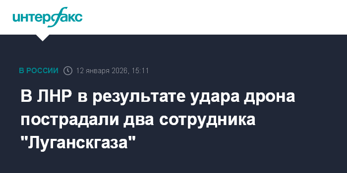 Москва. 12 января. INTERFAX.RU - В Кременском округе ЛНР в результате удара дрона пострадали два сотрудника ГУП ЛНР "Луганскгаз" , сообщили в правительстве региона.