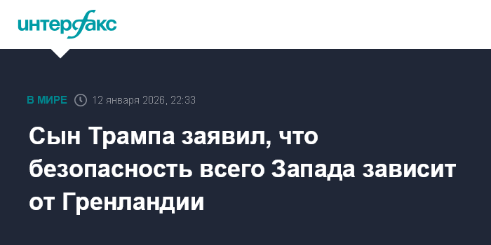 Москва. 12 января. INTERFAX.RU - Гренландия играет важнейшую роль не только для США, но и для всех западных стран, заявил в интервью телеканалу "Аль-Арабийя" сын американского президента предприниматель Эрик Трамп.