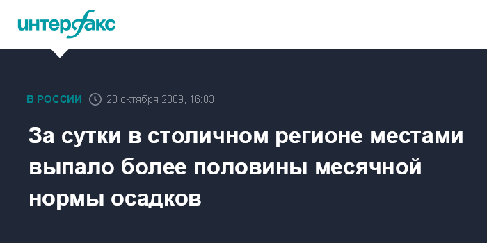 Москва. 23 октября. INTERFAX.RU - Нынешний октябрь подтвердил репутацию одного из самых дождливых месяцев в году, сообщили "Интерфаксу" в Гидрометеобюро Москвы и Московской области в пятницу. Как рассказал собеседник агентства, за последние 24 часа в столичном регионе в некоторых местах выпало от 20 до 30 мм осадков, что близко к половине месячной нормы (59 мм).