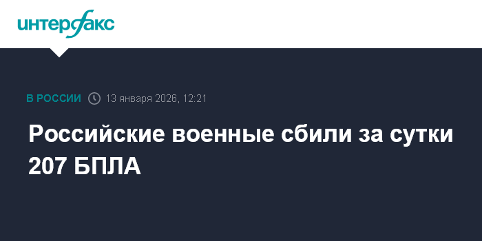Москва. 13 января. INTERFAX.RU - Министерство обороны России сообщило, что средства ПВО за сутки сбили 207 украинских беспилотников самолетного типа и 11 управляемых авиабомб ВСУ.