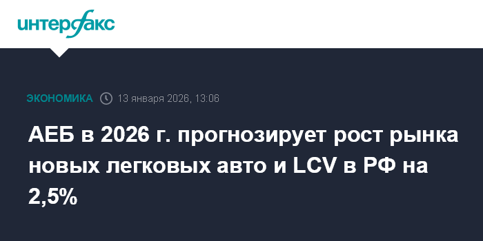 Москва. 13 января. INTERFAX.RU - Ассоциация европейского бизнеса (АЕБ) прогнозирует рост российского рынка новых легковых и легких коммерческих автомобилей (LCV) в 2026 году на 2,5%, до 1,4 млн штук, сообщил председатель комитета автопроизводителей АЕБ Алексей Калицев на онлайн-конференции во вторник.
