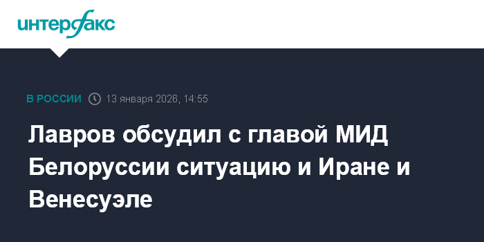 Москва. 13 января. INTERFAX.RU - Главы МИД Белоруссии и России Максим Рыженков и Сергей Лавров обсудили во вторник в ходе телефонного разговора ситуацию в Иране и Венесуэле, сообщили в пресс-службе белорусского внешнеполитического ведомства.