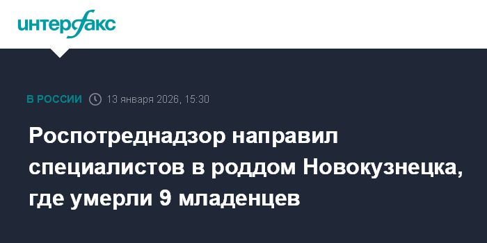 Москва. 13 января. INTERFAX.RU - Роспотребнадзор направил группу специалистов и экспертов в Новокузнецк для проведения эпидемиологического расследования и лабораторных исследований в новокузнецком родильном доме, где умерли несколько младенцев, сообщили в ведомстве.
